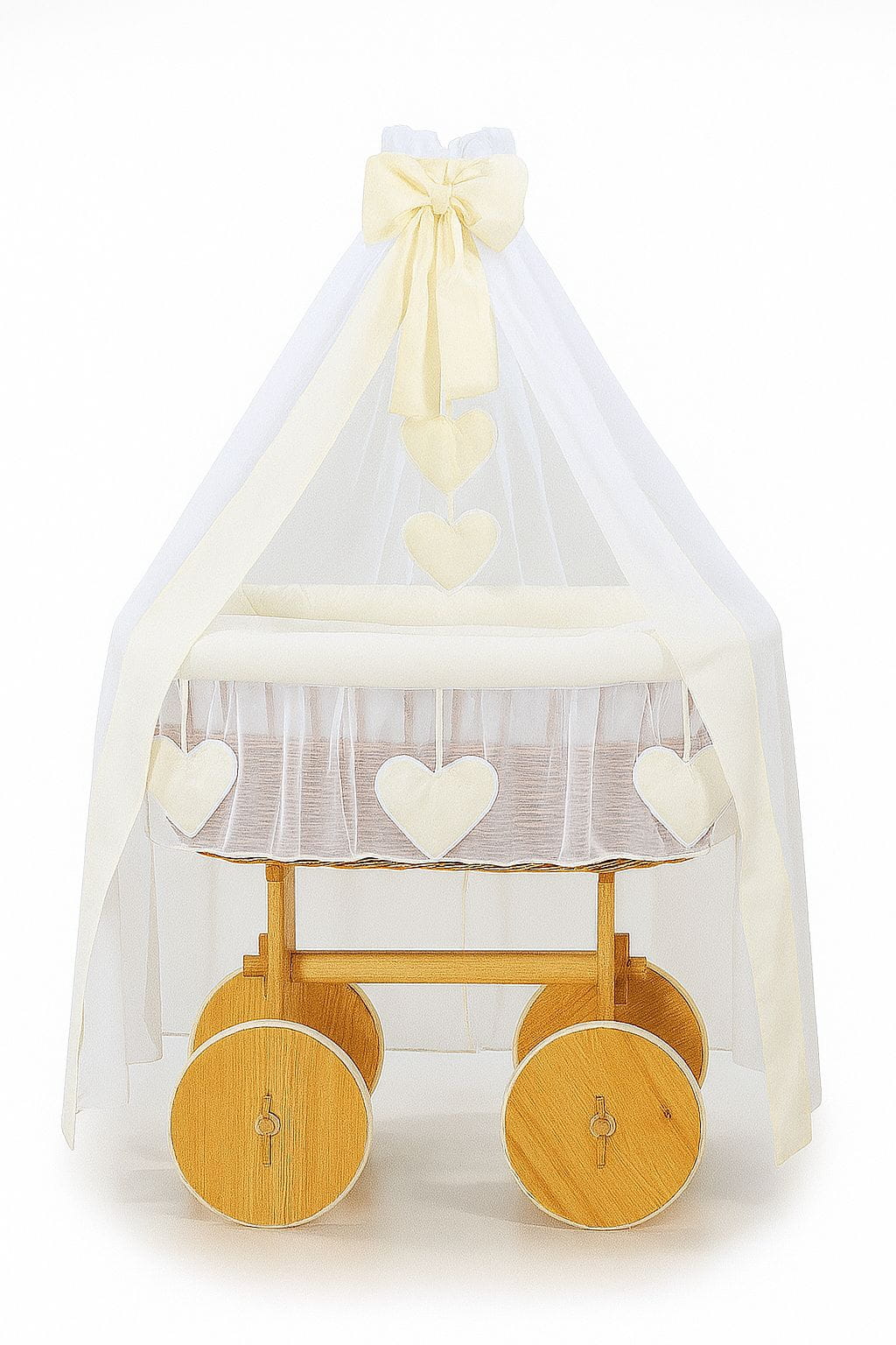 - Obszycie 3-warstwowe kosza z miękką włókniną, wykończone wokół kosza falbaną z sercami, zdejmowane do prania