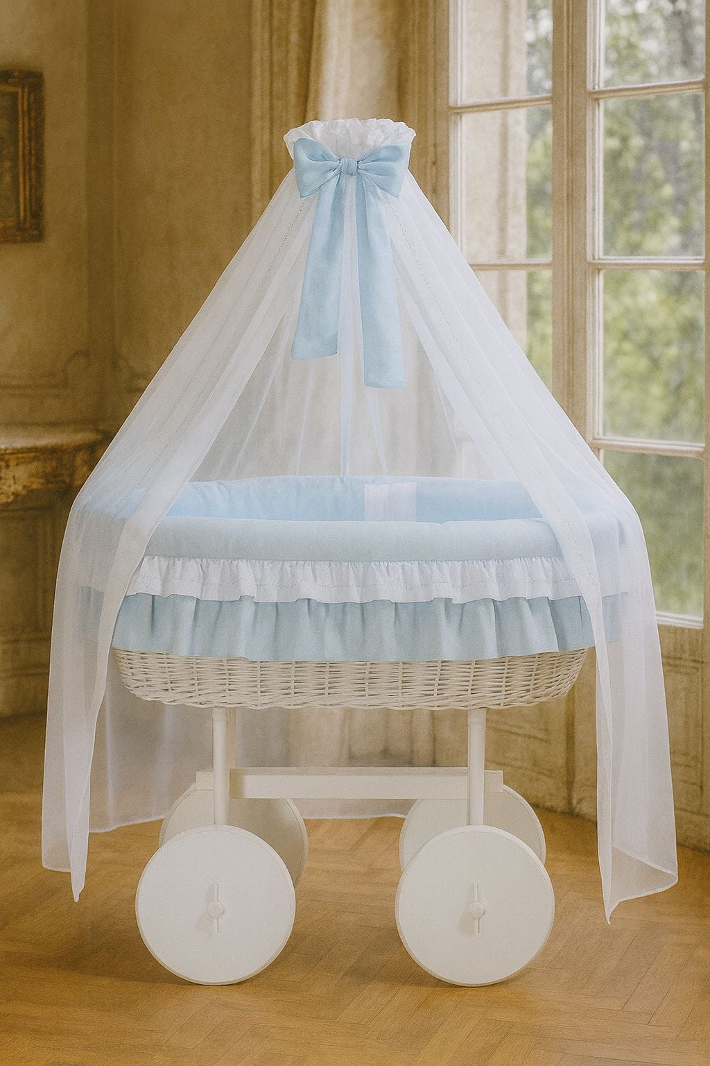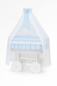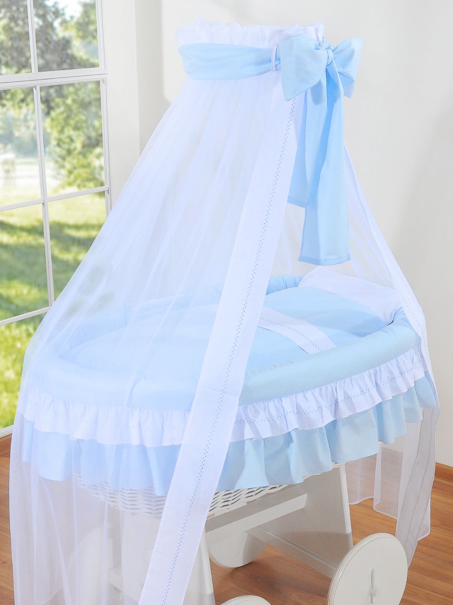Wiklinowy kosz Mojżesza z baldachimem Deluxe Bellamy - biały + niebieska pościel
