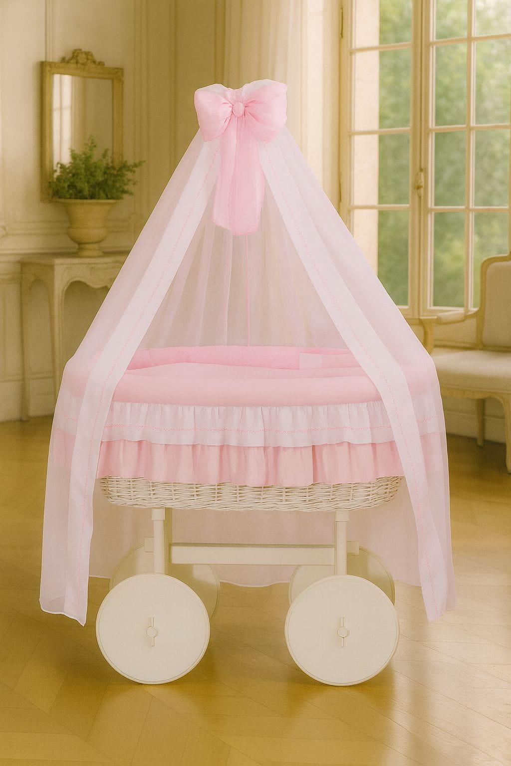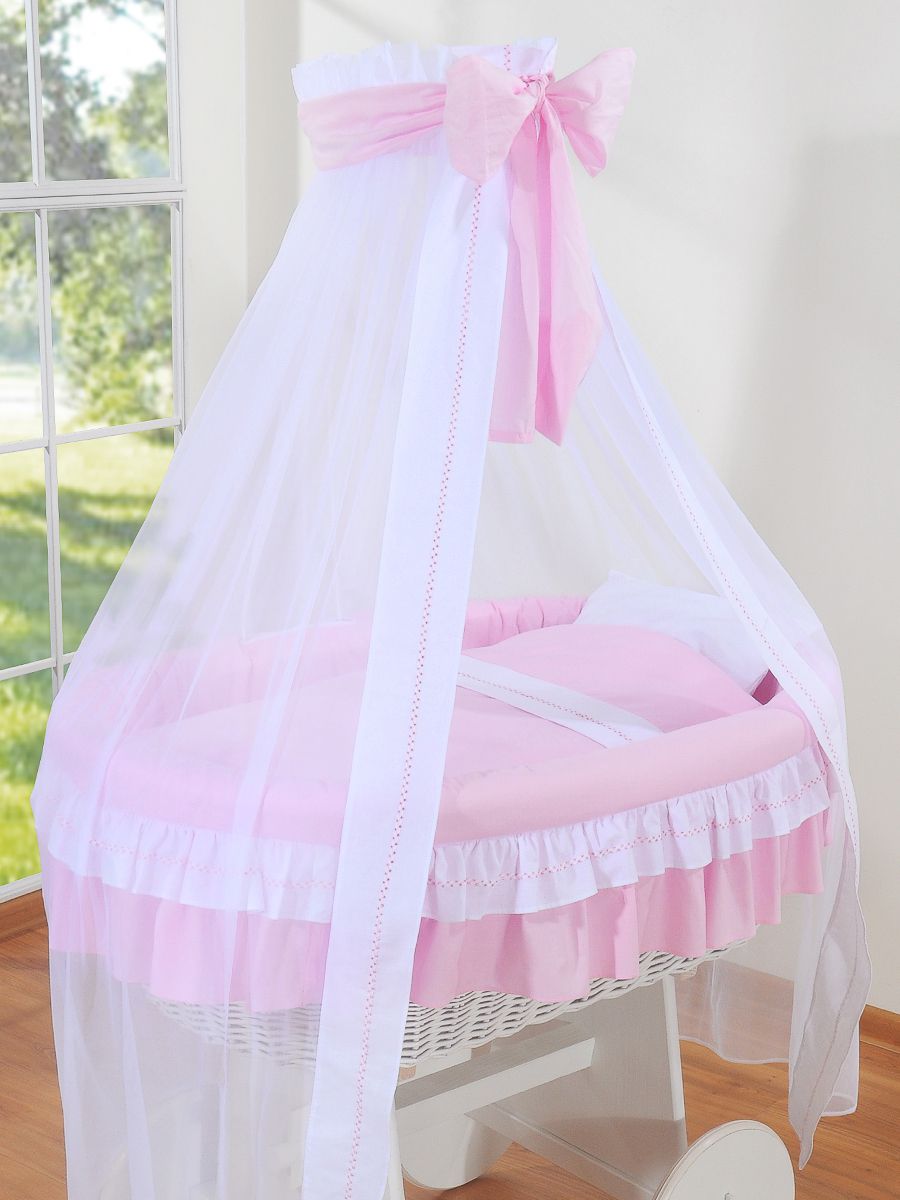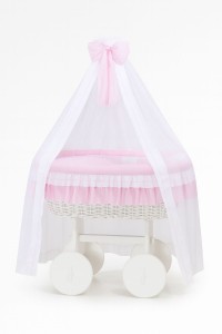 Wiklinowy kosz Mojżesza z baldachimem Deluxe Bellamy - biały + różowa pościel