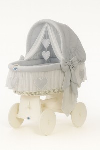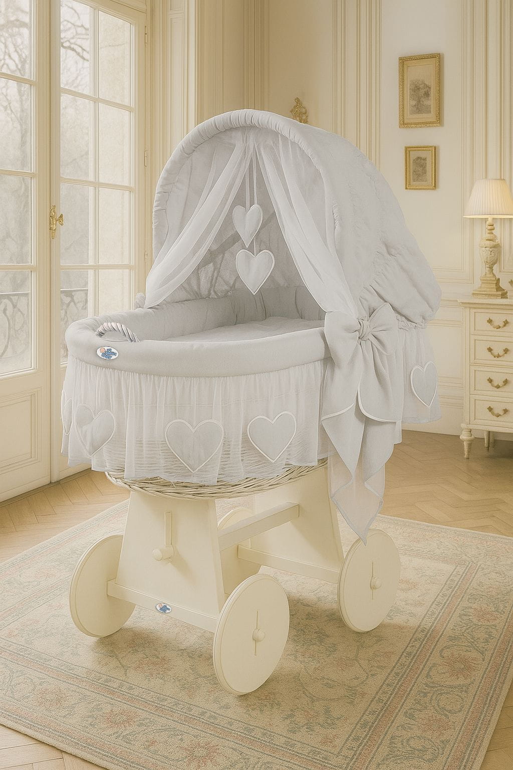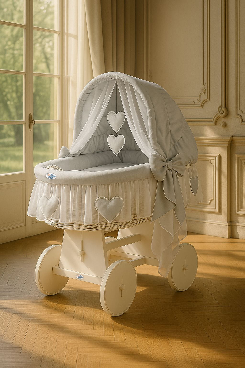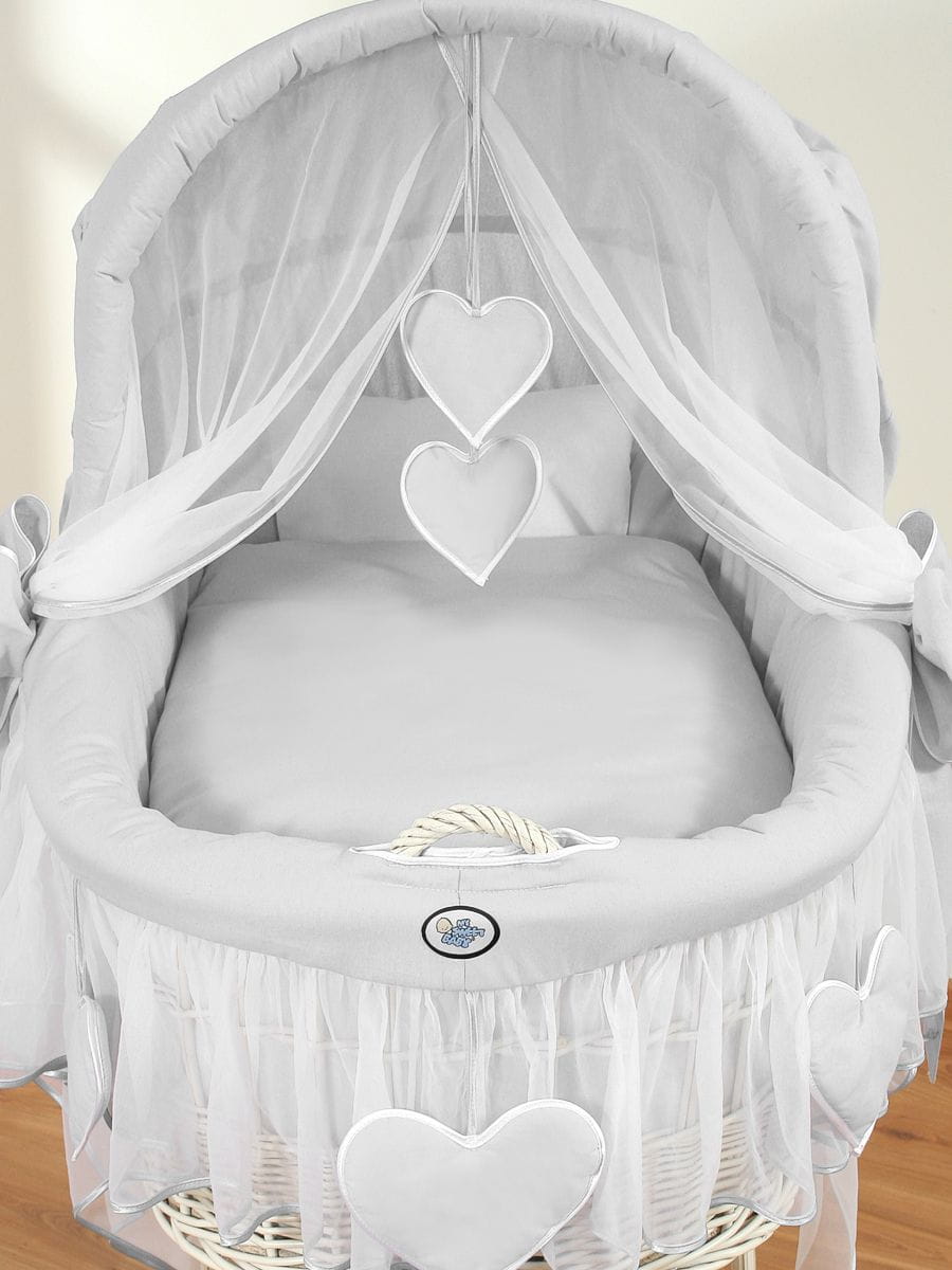 Wiklinowy kosz Mojżesza ze składaną budką Amelia - biały + szara pościel