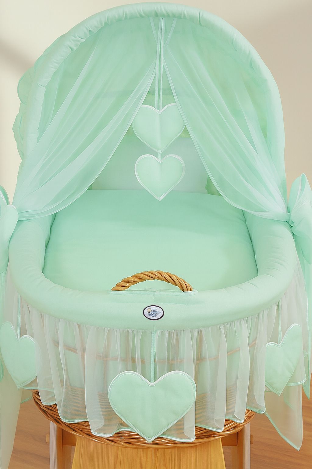 - Obszycie 3-warstwowe kosza z miękką włókniną, wykończone wokół kosza falbaną z sercami, zdejmowane do prania