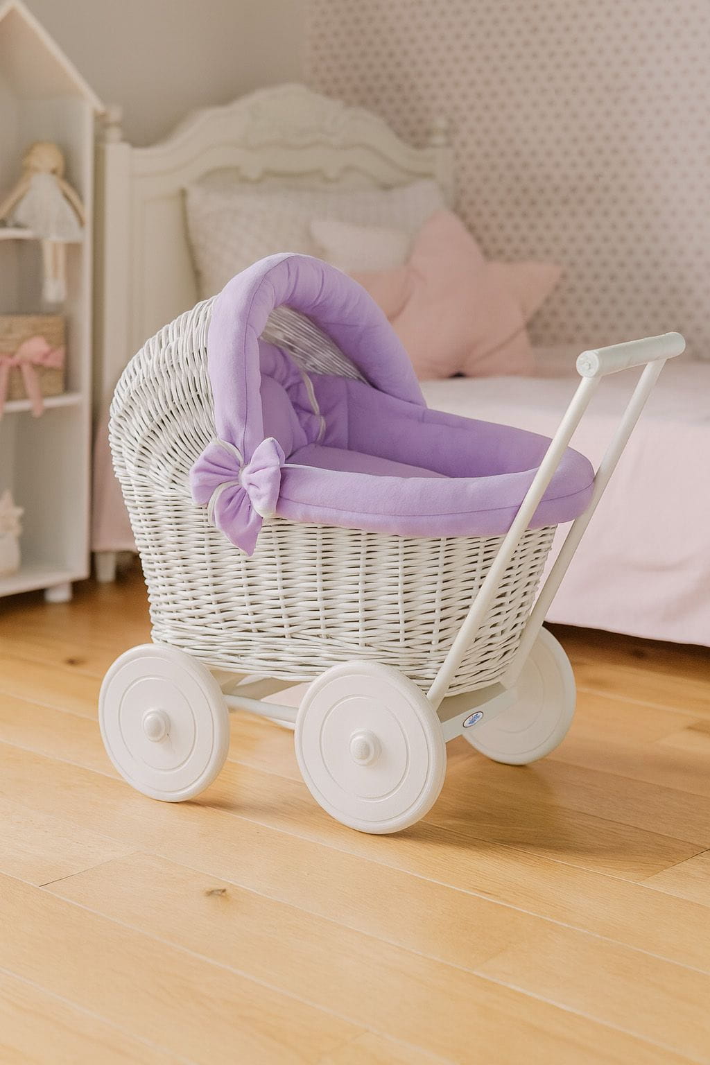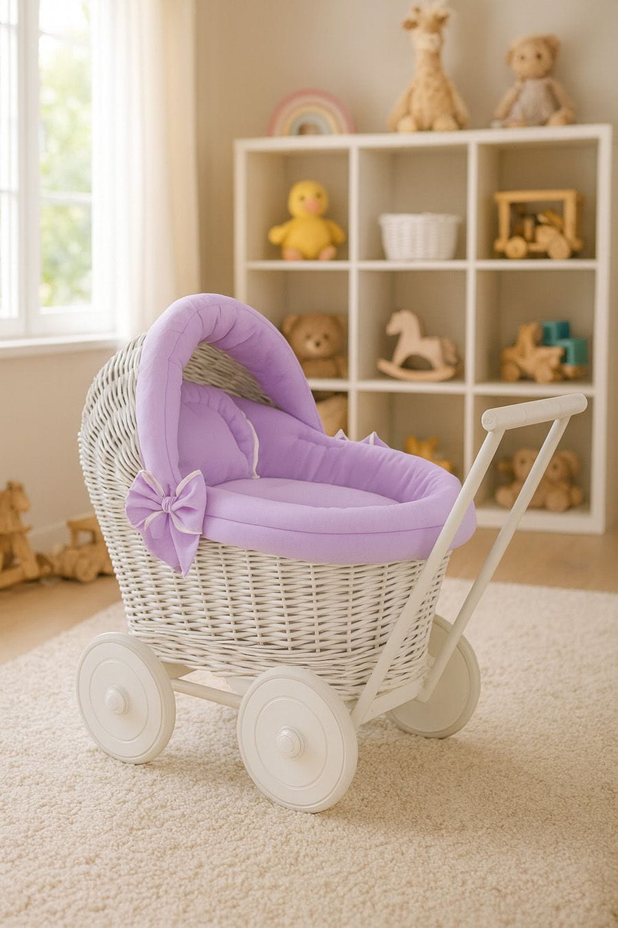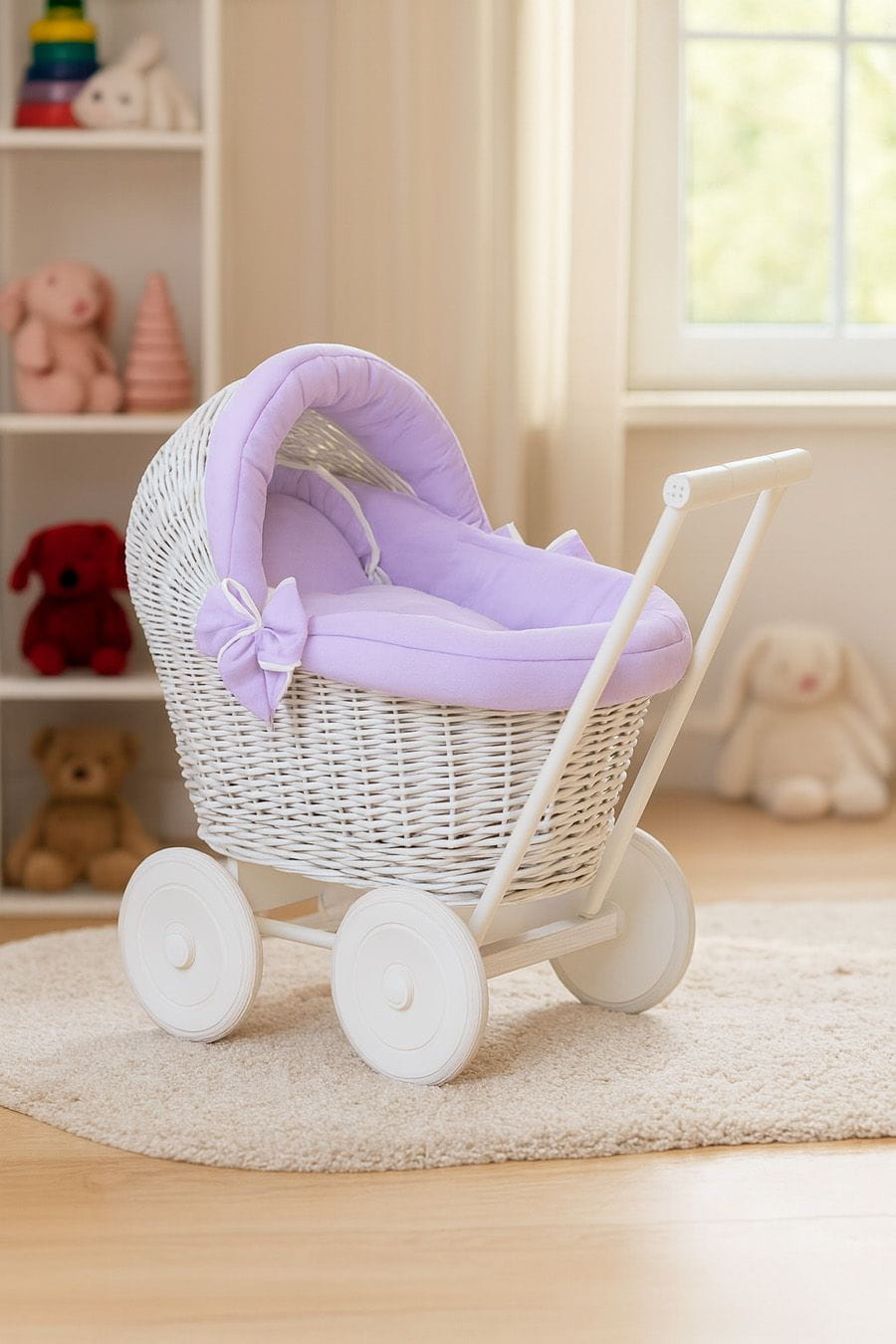 Wiklinowy wózek dla lalek pchacz biały z fioletową pościelką i miękką wyściółką STELLA