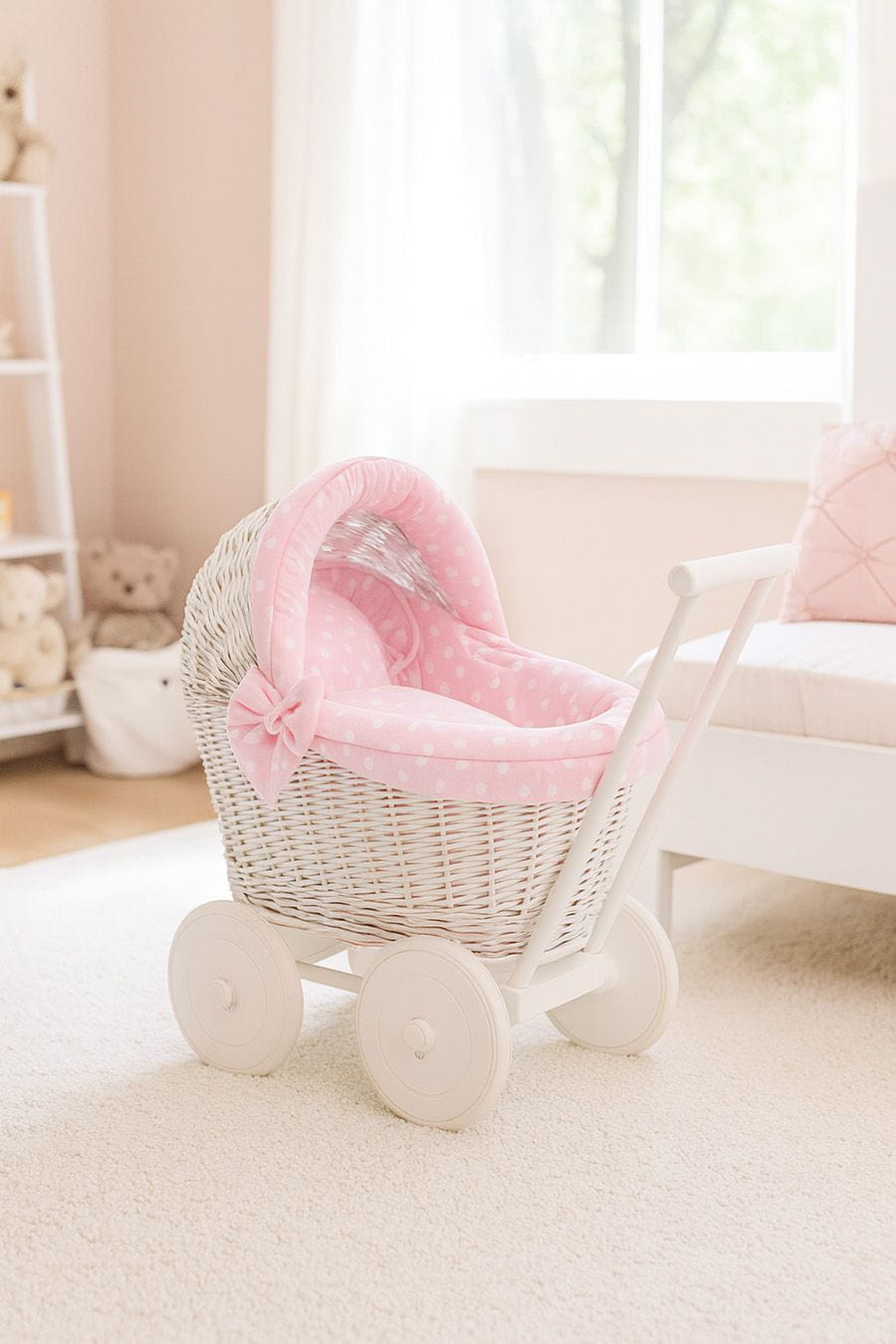 Wiklinowy wózek dla lalek pchacz biały z różową pościelką i miękką wyściółką STELLA