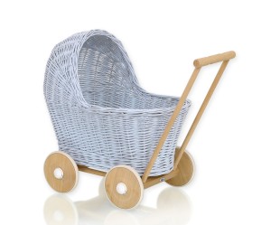 Wiklinowy wózek dla lalek pchacz - z naturalnej wikliny, na naturalnym drewnianym podwoziu z drewnianymi kółkami.