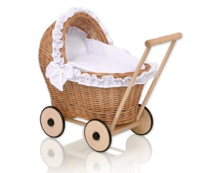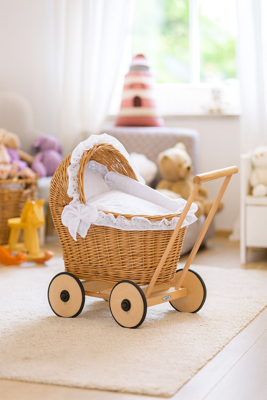 Wiklinowy wózek dla lalek pchacz z białą haftowaną pościelką i miękką wyściółką AURORA - naturalny