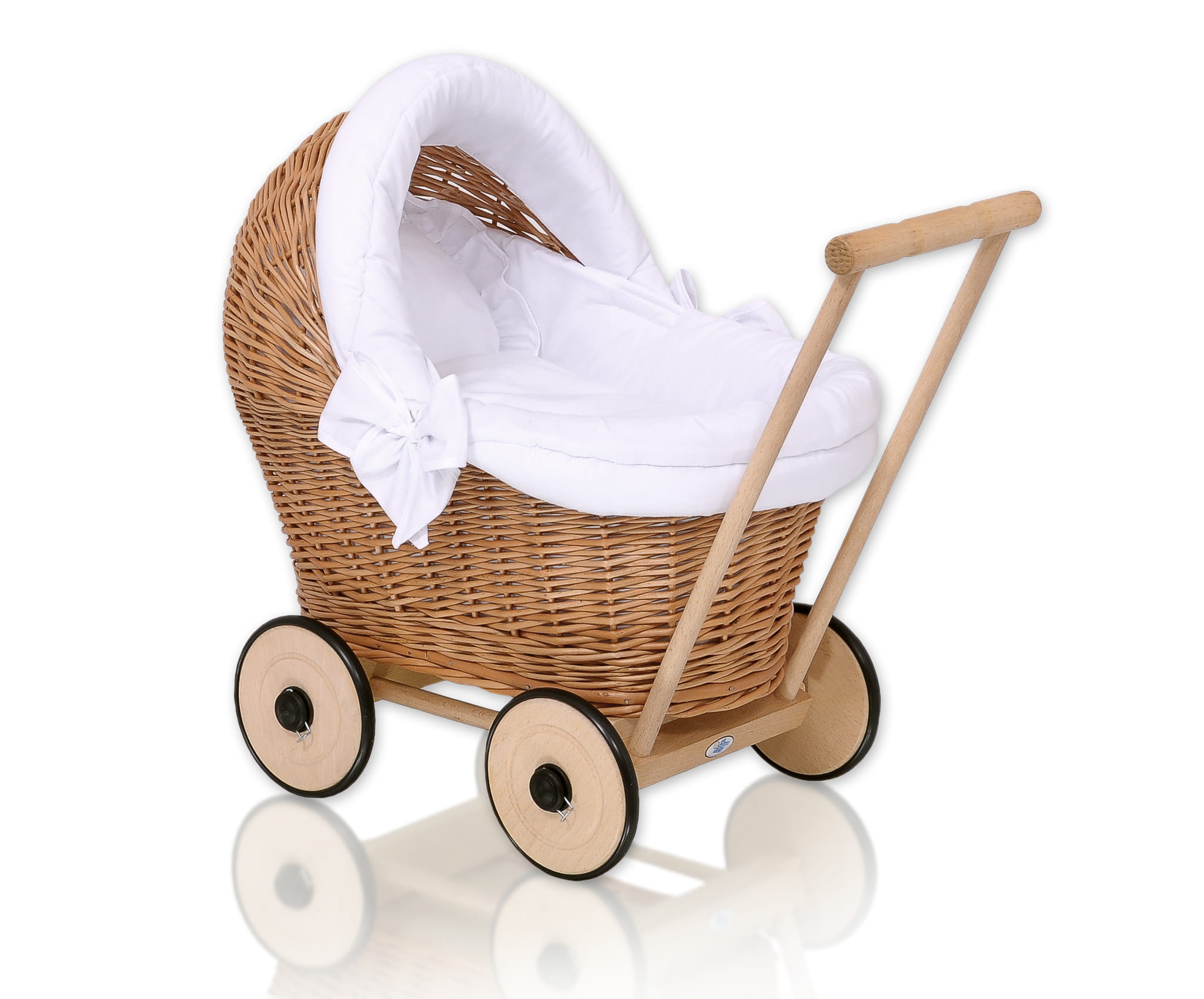 Wiklinowy wózek dla lalek pchacz z białą pościelką i miękką wyściółką STELLA - naturalny