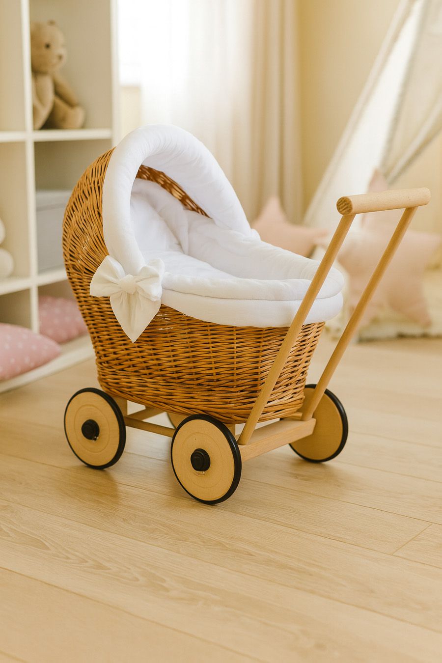 Wiklinowy wózek dla lalek z pościelką – ręcznie robiony pchacz z naturalnych materiałów