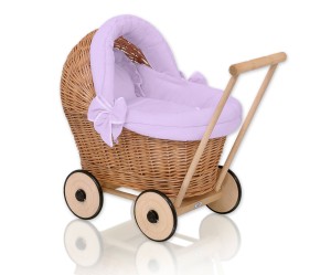 Wiklinowy wózek dla lalek pchacz z fioletową pościelką i miękką wyściółką STELLA - naturalny