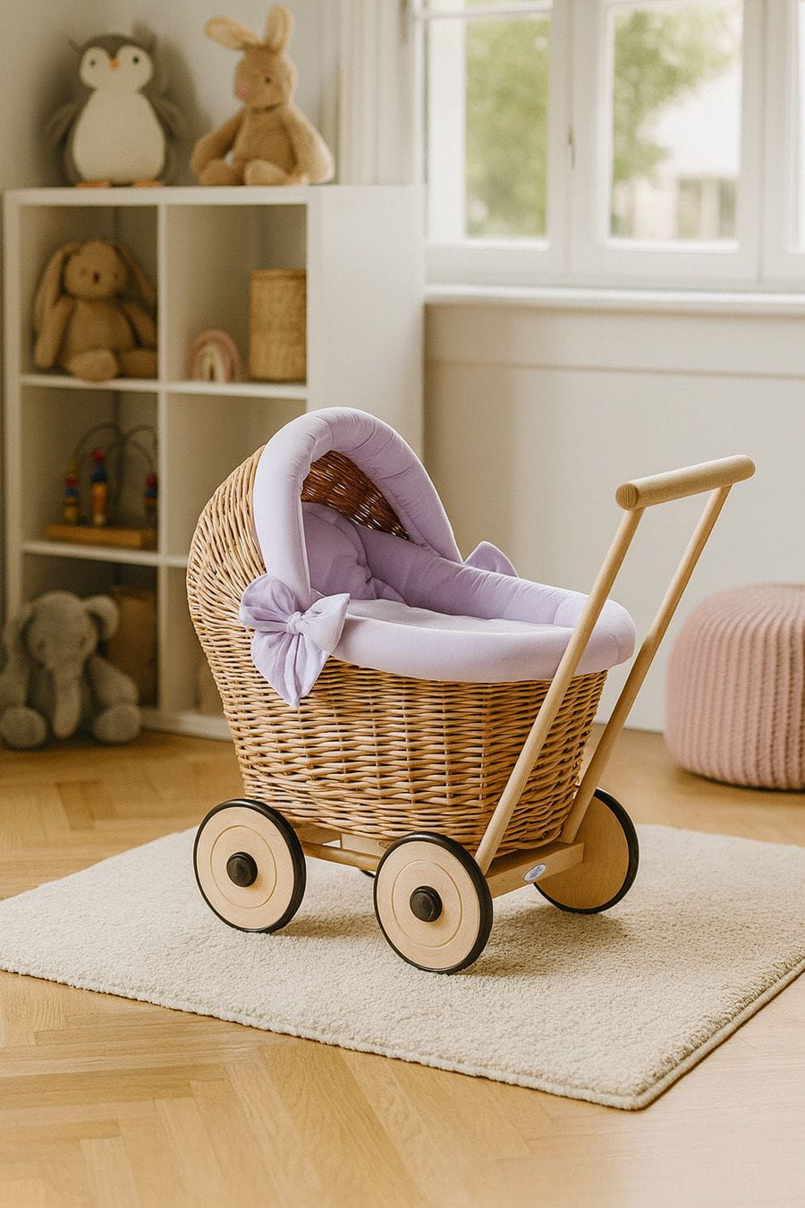 Podaruj swojemu dziecku wyjątkowy wózek dla lalek, który zachwyca urokiem i jakością wykonania. Ten uroczy wiklinowy wózek pchacz to połączenie klasycznego wzornictwa z naturalnymi materiałami i starannym rzemiosłem.