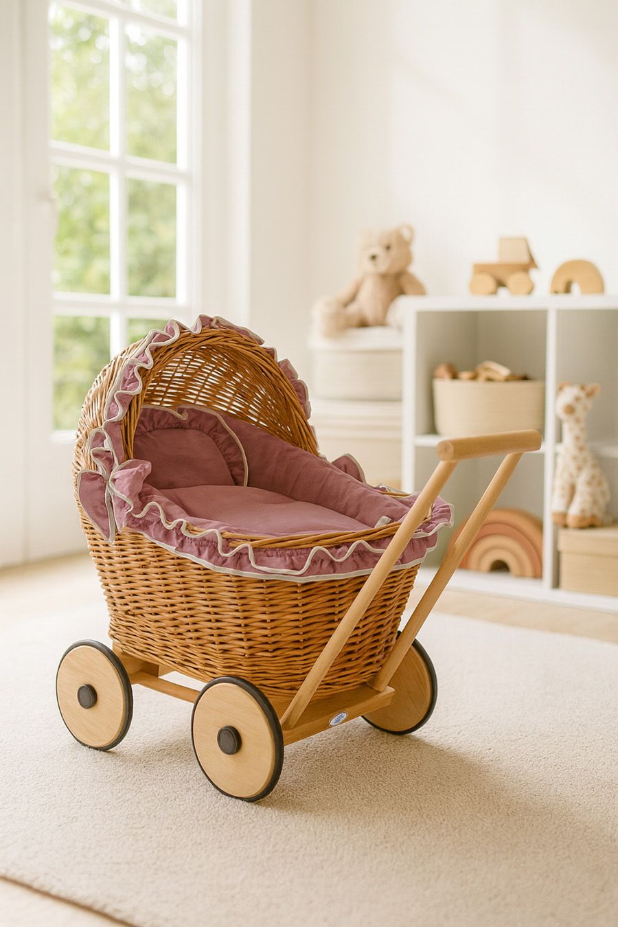 Wiklinowy wózek dla lalek z pościelką – ręcznie robiony pchacz z naturalnych materiałów
