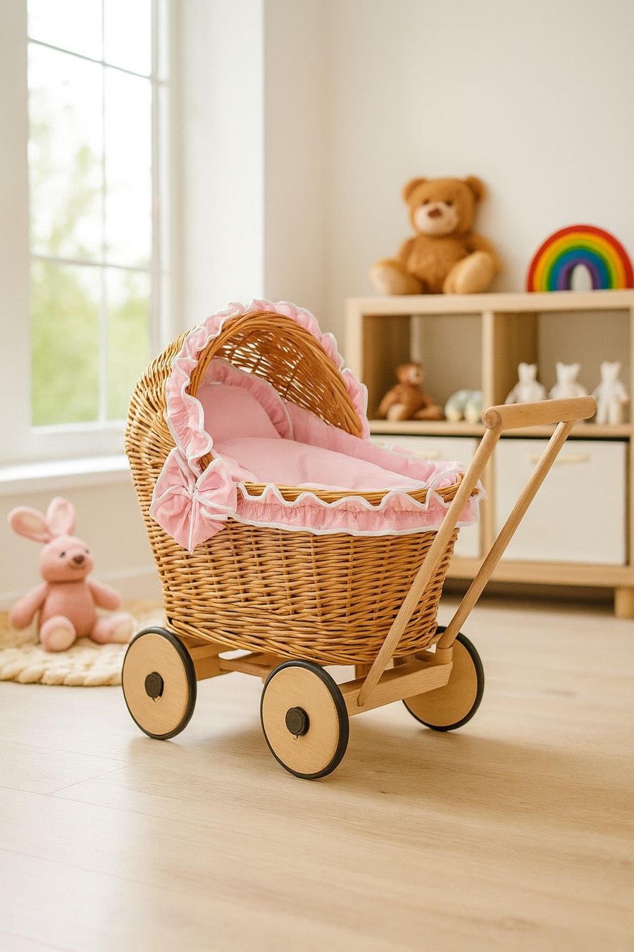 Podaruj swojemu dziecku wyjątkowy wózek dla lalek, który zachwyca urokiem i jakością wykonania. Ten uroczy wiklinowy wózek pchacz to połączenie klasycznego wzornictwa z naturalnymi materiałami i starannym rzemiosłem.