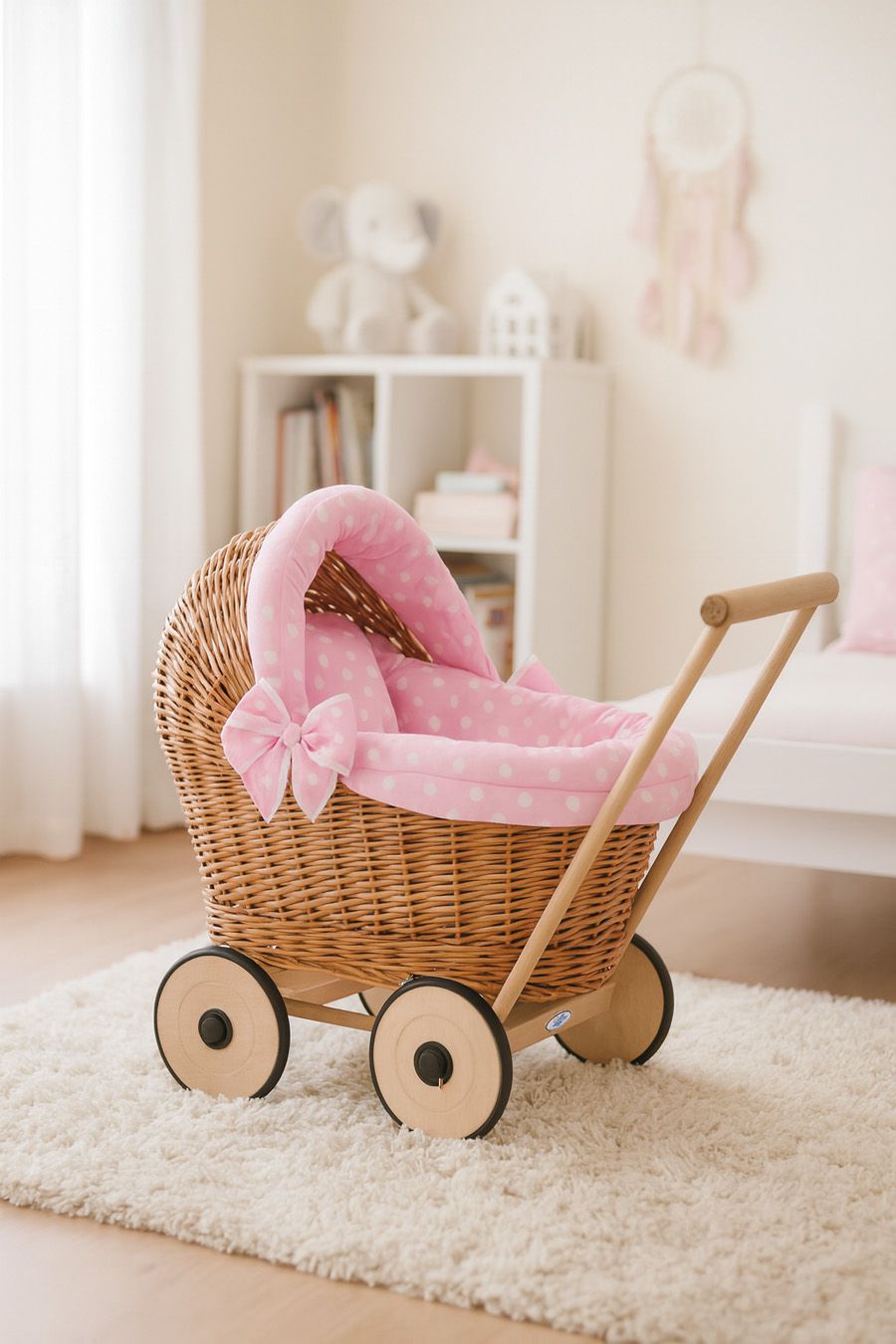 Wiklinowy wózek dla lalek z pościelką – ręcznie robiony pchacz z naturalnych materiałów