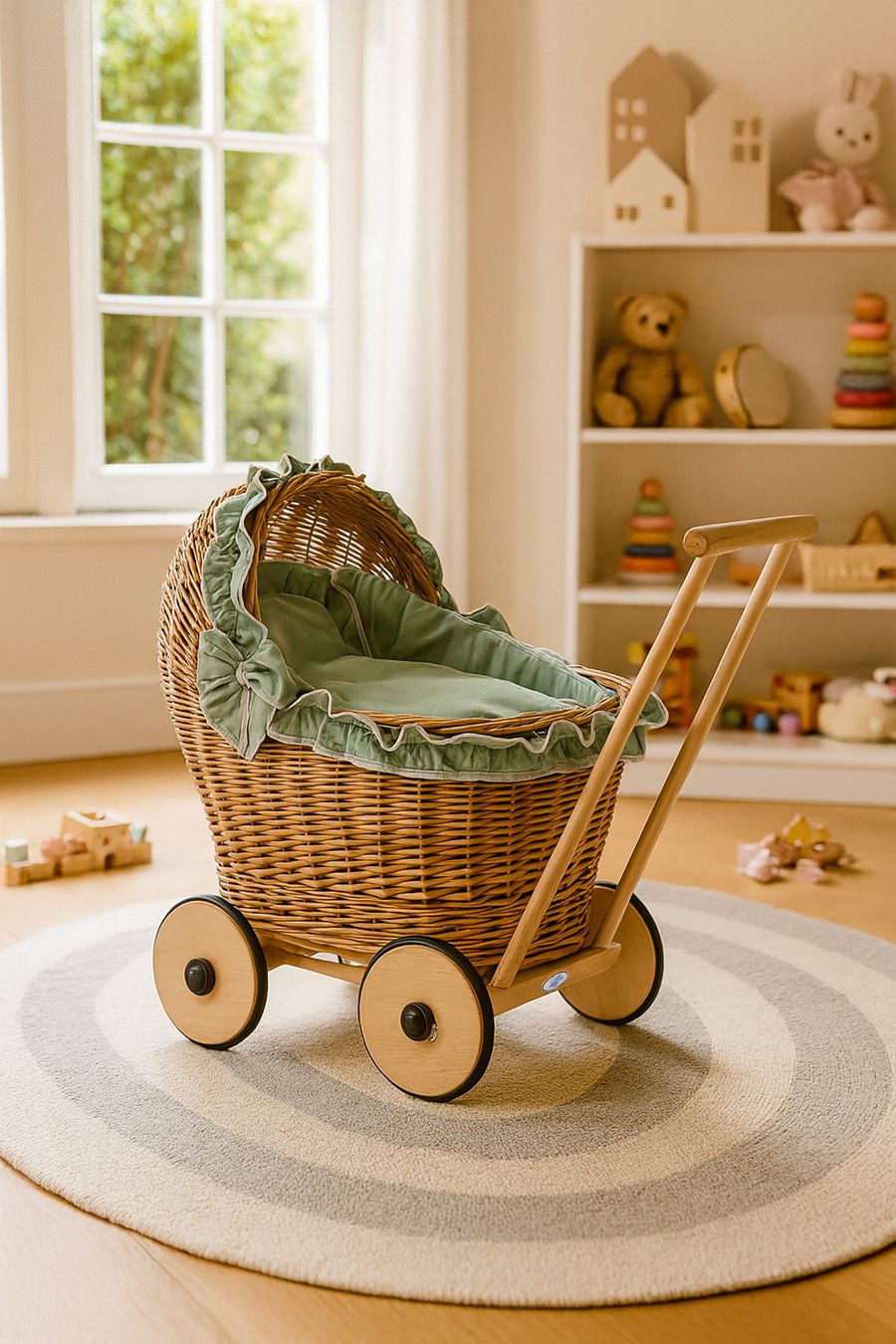 Wiklinowy wózek dla lalek pchacz z szałwiową pościelką i miękką wyściółką CHIARA - naturalny