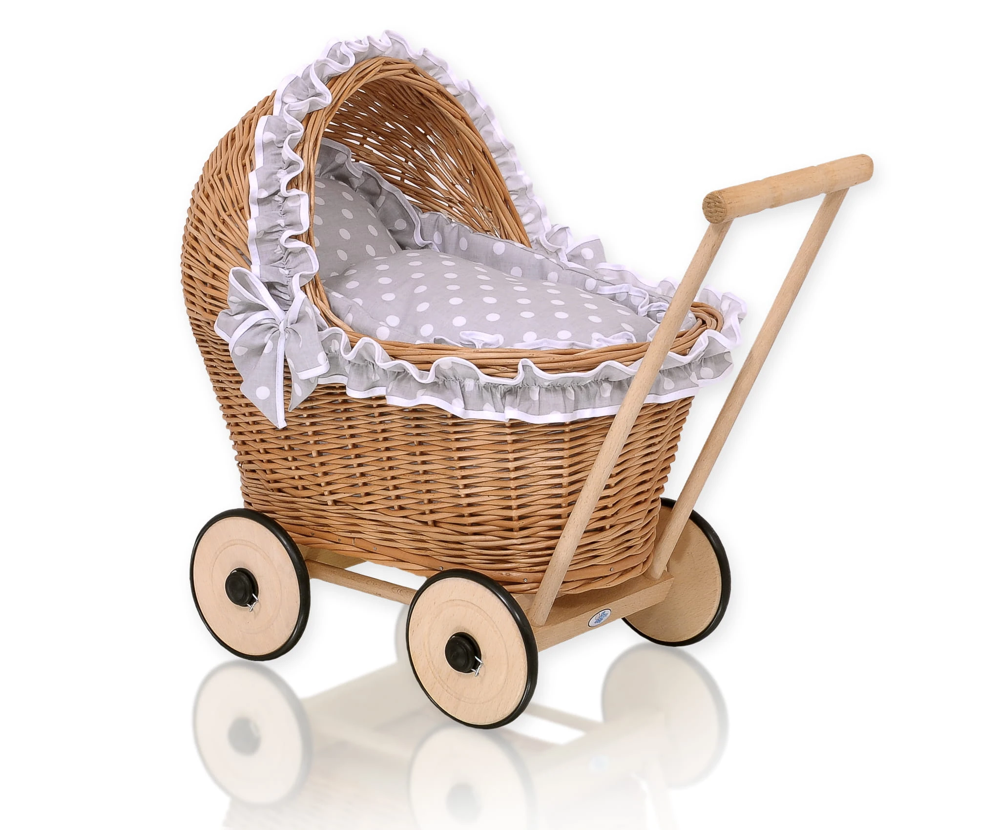 Wiklinowy wózek dla lalek pchacz z szarą pościelką i miękką wyściółką CHIARA - naturalny