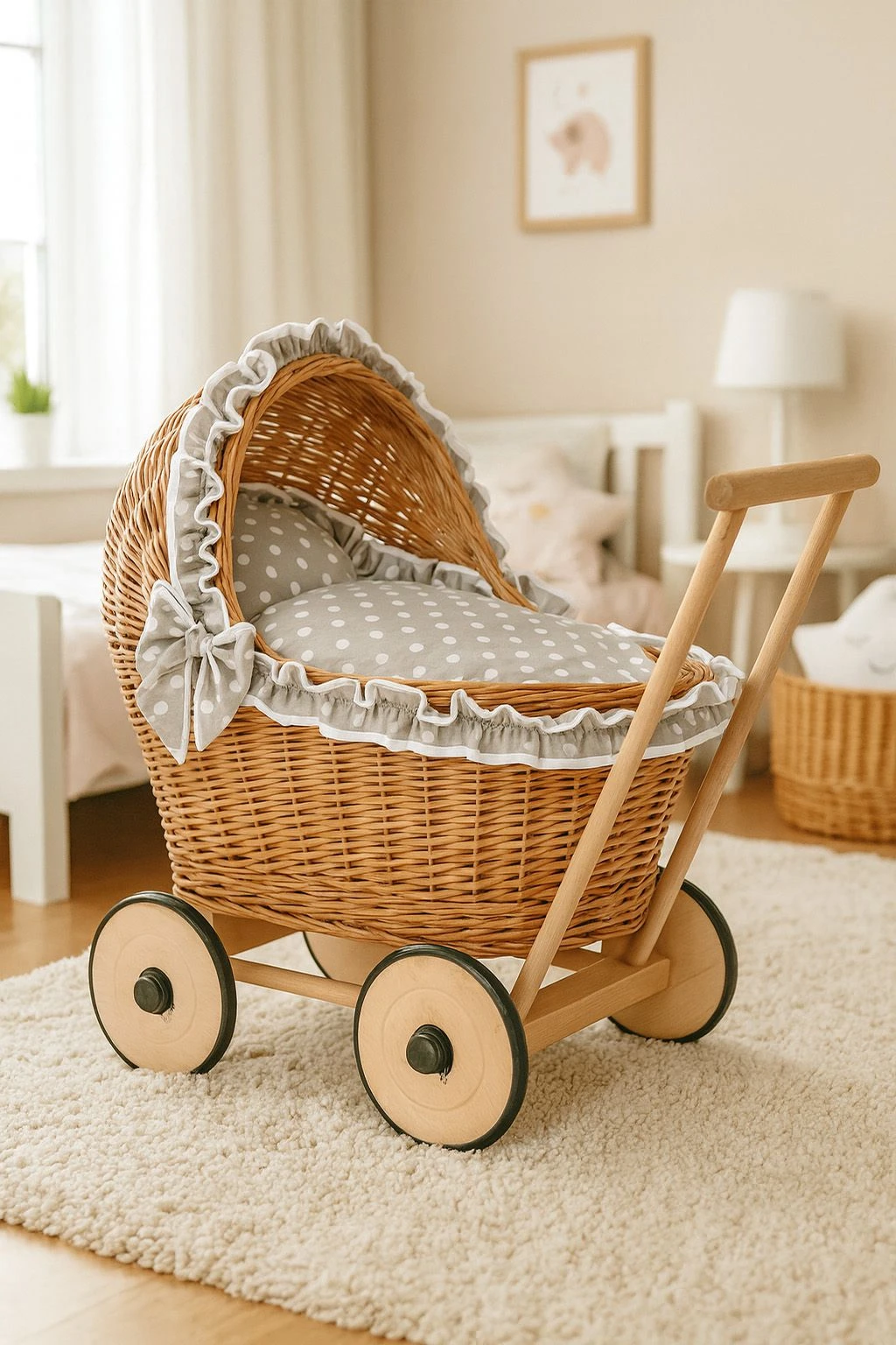 Wiklinowy wózek dla lalek z pościelką – ręcznie robiony pchacz z naturalnych materiałów