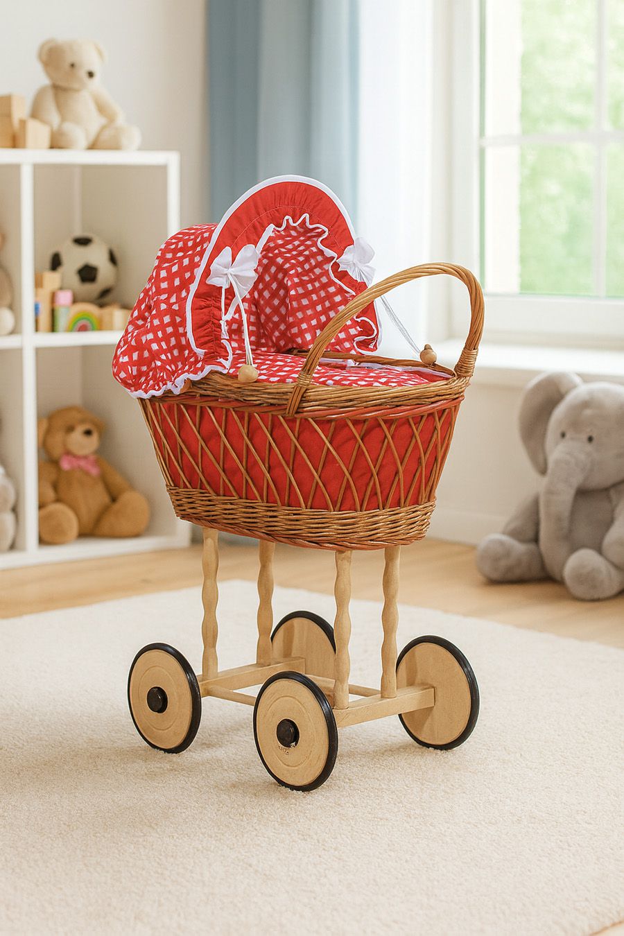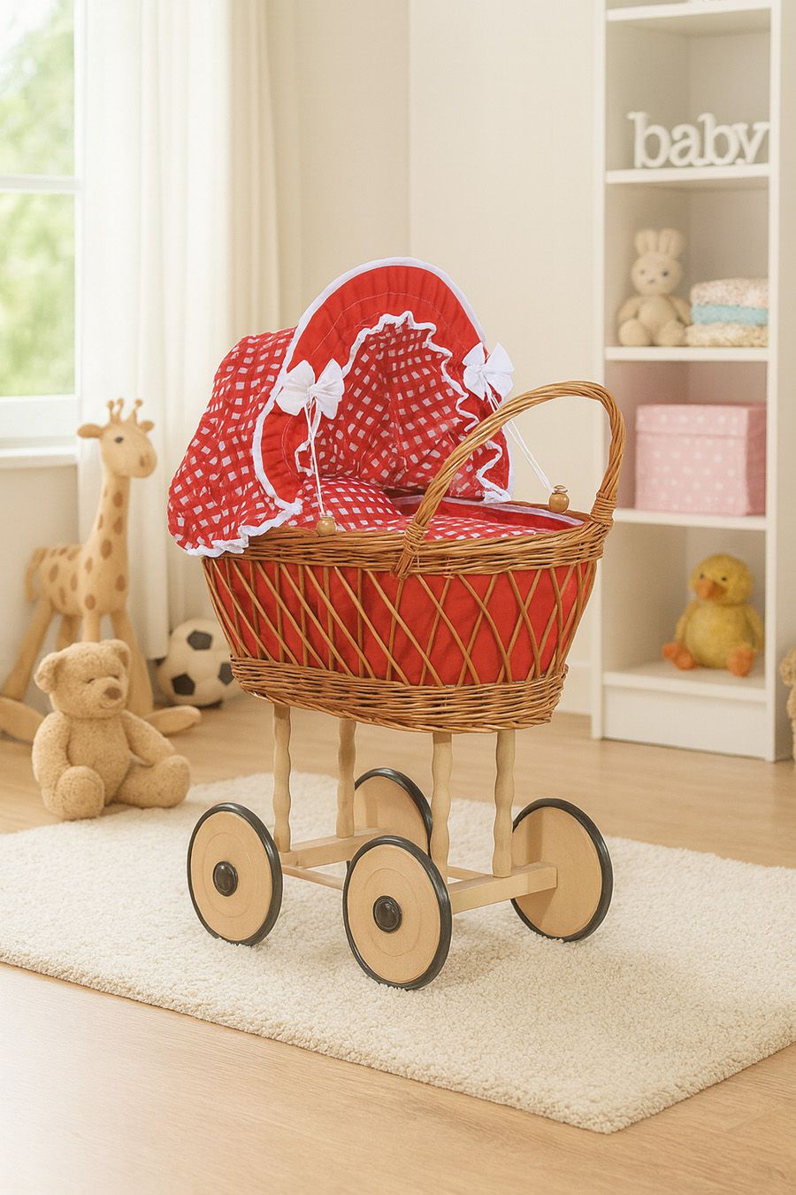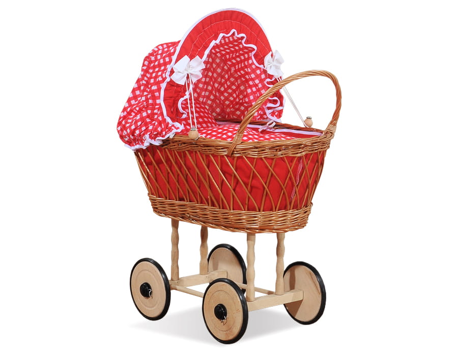 Wiklinowy wózek dla lalek wysoki ażurowy z czerwoną pościelką i wyściółką VERONICA - naturalny