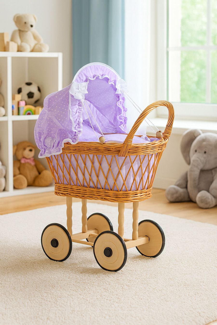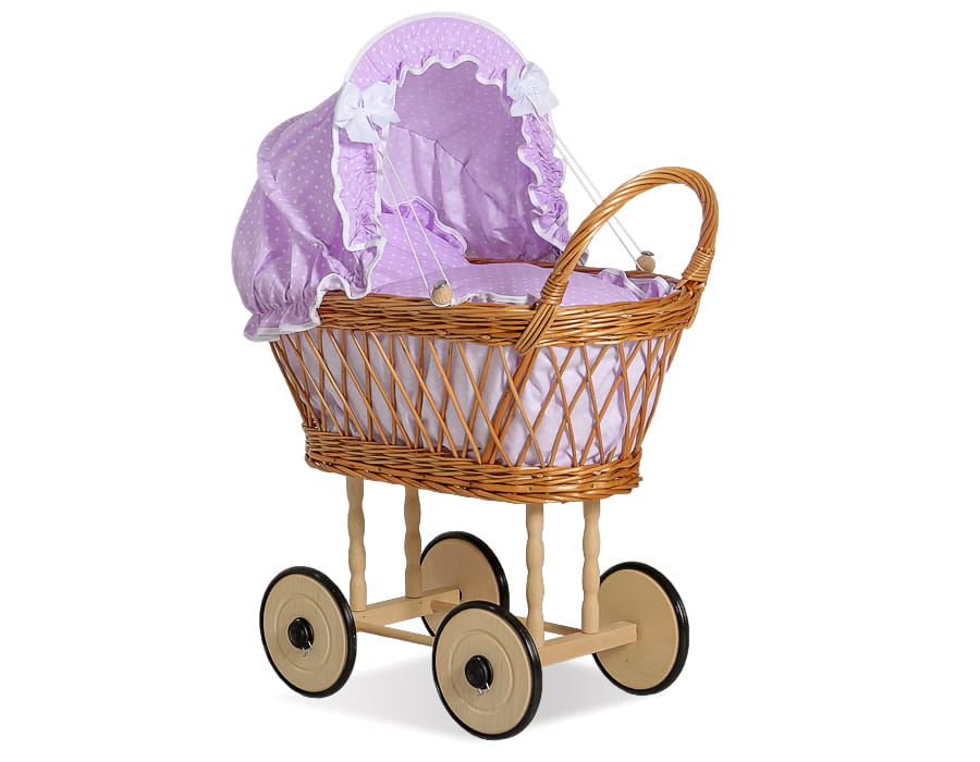 Wiklinowy wózek dla lalek wysoki ażurowy z fioletową pościelką i wyściółką VERONICA - naturalny