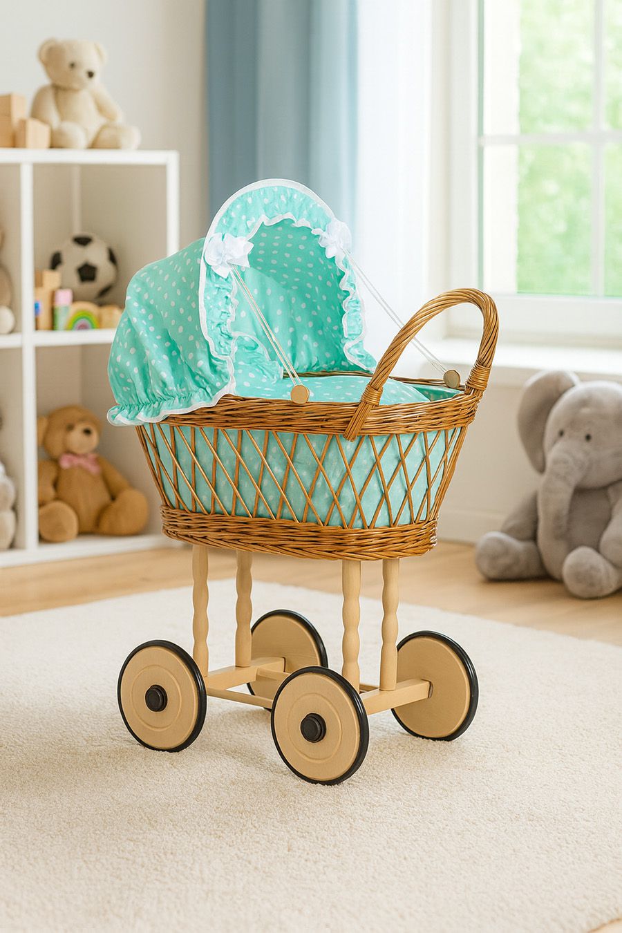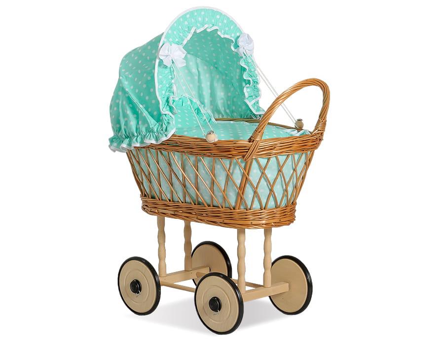 Wiklinowy wózek dla lalek wysoki ażurowy z miętową pościelką i wyściółką VERONICA - naturalny