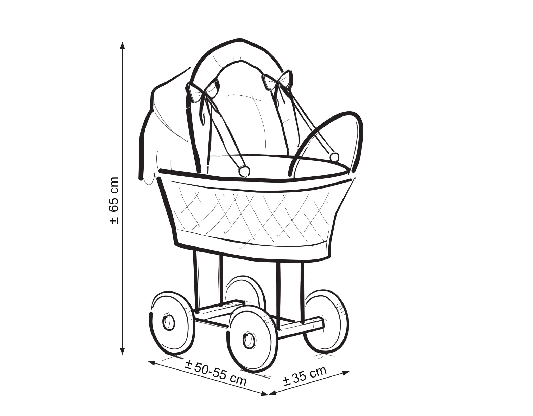 Wnętrze wózka wyłożone jest miękką, bawełnianą wyściółką oraz wyposażone w komplet uroczej pościeli dla lalek. Ruchoma budka z tkaniny, ozdobiona kokardkami, dopełnia całości, tworząc niezwykle stylowy i uroczy design.