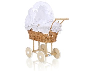 Wiklinowy wózek dla lalek - z naturalnej wikliny, na naturalnym wysokim drewnianym podwoziu z drewnianymi kółkami.