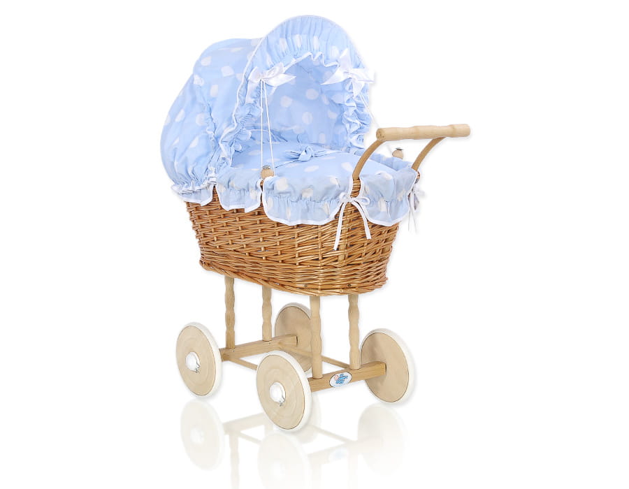 Wiklinowy wózek dla lalek wysoki z błękitną pościelką i wyściółką- naturalny