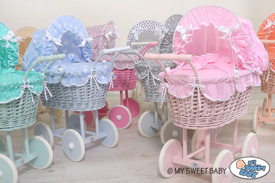 Świetny prezent dla małej dziewczynki - piękny wiklinowy wózek dla lalek MY SWEET BABY, stylowy i niepowtarzalny. Ręcznie wykonany wózek, najwyższej jakości rękodzieło. Naturalna polska wiklina z ekologicznych upraw. Wózeczek ma piękny zaokrąglony kształt. Drewniane solidne podwozie z naturalnego drewna bukowego, najwyższej jakości. Solidna stabilna rączka ułatwia wygodne prowadzenie wózka. Wysokie podwozie wygodne dla starszego dziecka. Drewniane kółka zabezpieczone gumową oponką. Kółka mocowane są na metalowe ośki. Specjalne zabezpieczenie "click-clack" bezpiecznie mocuje kółka i sprawia że kółka lekko się obracają. W komplecie również piękna pościel dla lalki - becik z falbanką, wykończoną lamówką.