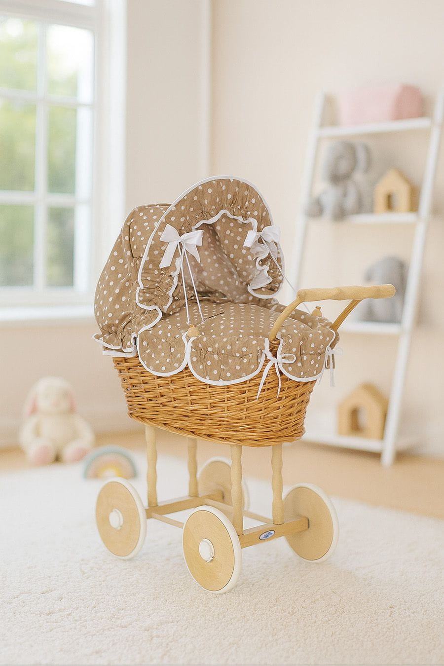 Wnętrze wózka wyłożone jest miękką, bawełnianą wyściółką i wyposażone w komplet pościeli dla lalek. Ruchoma budka z tkaniny, ozdobiona kokardkami, dodaje całości wyjątkowego uroku.