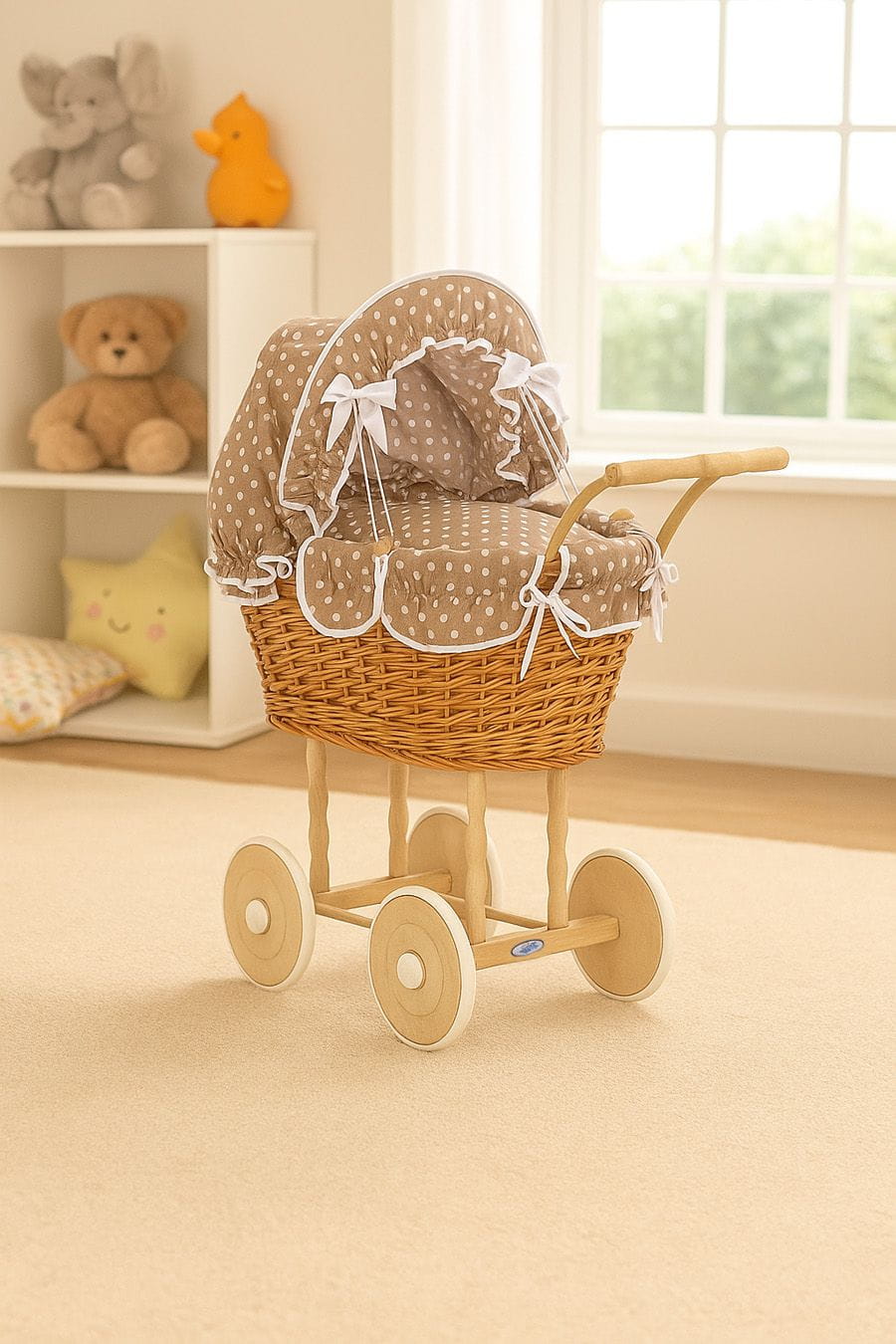 Wiklinowy wózek dla lalek wysoki z brązową pościelką i wyściółką NATALIA naturalny
