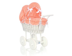 Wiklinowy wózek dla lalek wysoki z brzoskwiniową pościelką i wyściółką- biały
