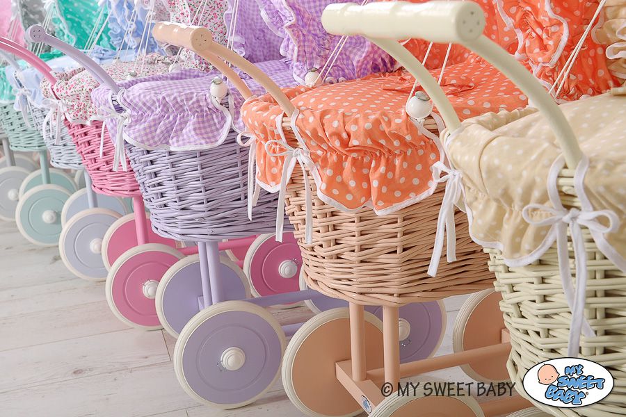 Świetny prezent dla małej dziewczynki - piękny wiklinowy wózek dla lalek MY SWEET BABY, stylowy i niepowtarzalny. Ręcznie wykonany wózek, najwyższej jakości rękodzieło. Naturalna polska wiklina z ekologicznych upraw. Wózeczek ma piękny zaokrąglony kształt. Drewniane solidne podwozie z naturalnego drewna bukowego, najwyższej jakości. Solidna stabilna rączka ułatwia wygodne prowadzenie wózka. Wysokie podwozie wygodne dla starszego dziecka. Drewniane kółka zabezpieczone gumową oponką. Kółka mocowane są na metalowe ośki. Specjalne zabezpieczenie "click-clack" bezpiecznie mocuje kółka i sprawia że kółka lekko się obracają. W komplecie również piękna pościel dla lalki - becik z falbanką, wykończoną lamówką.