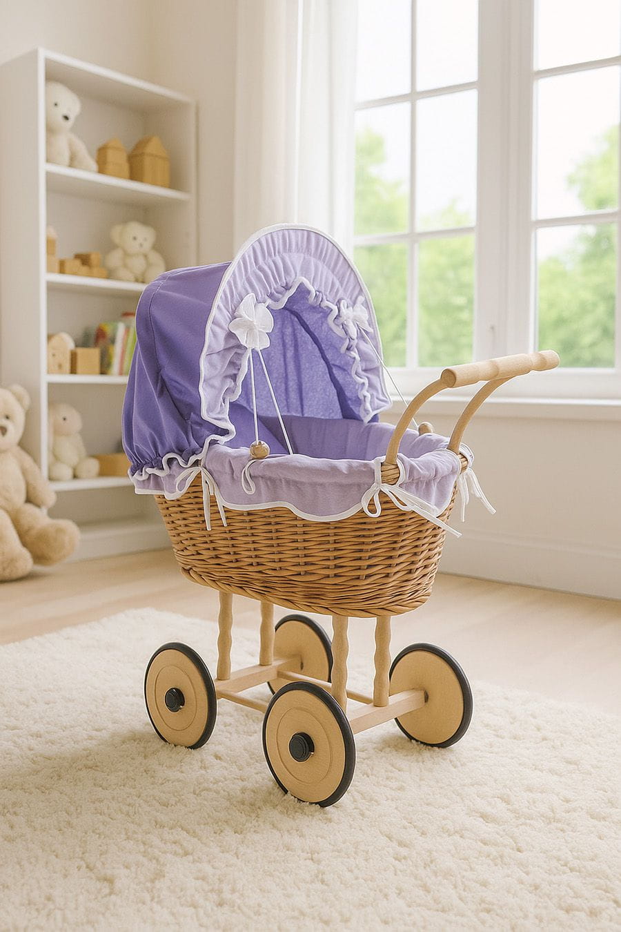 Wiklinowy wózek dla lalek wysoki z fioletową pościelką i wyściółką NATALIA naturalny