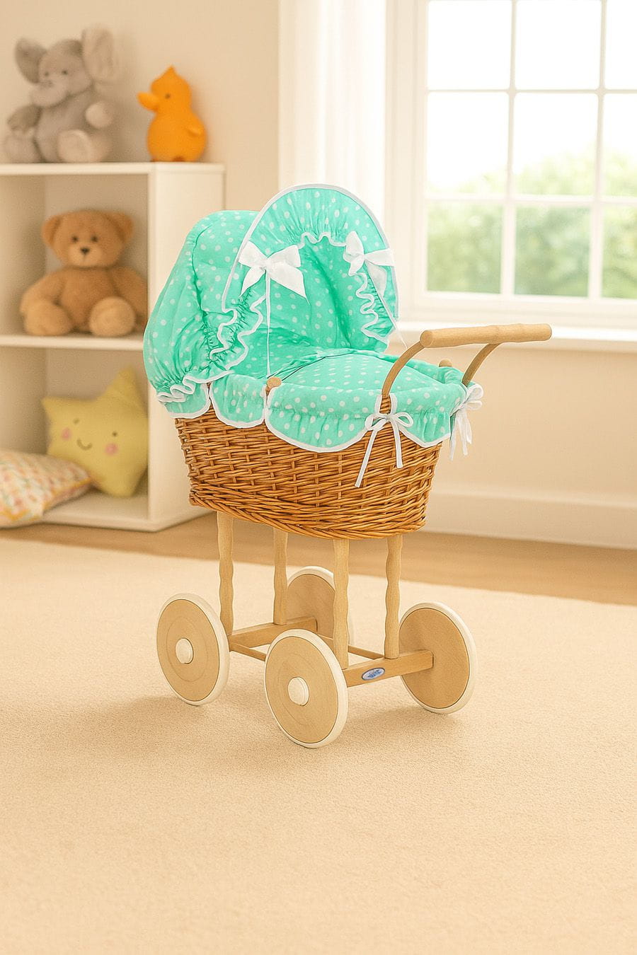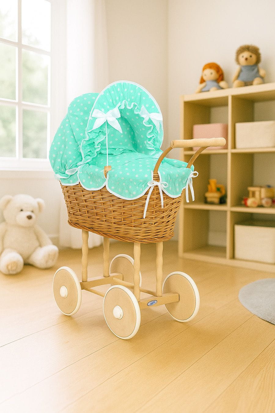 Wiklinowy wózek dla lalek wysoki z miętową pościelką i wyściółką NATALIA naturalny