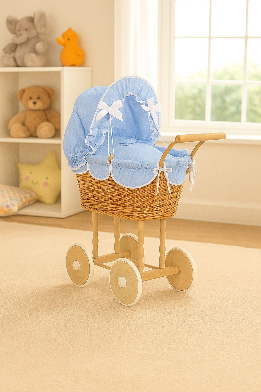 Wnętrze wózka wyłożone jest miękką, bawełnianą wyściółką i wyposażone w komplet pościeli dla lalek. Ruchoma budka z tkaniny, ozdobiona kokardkami, dodaje całości wyjątkowego uroku.