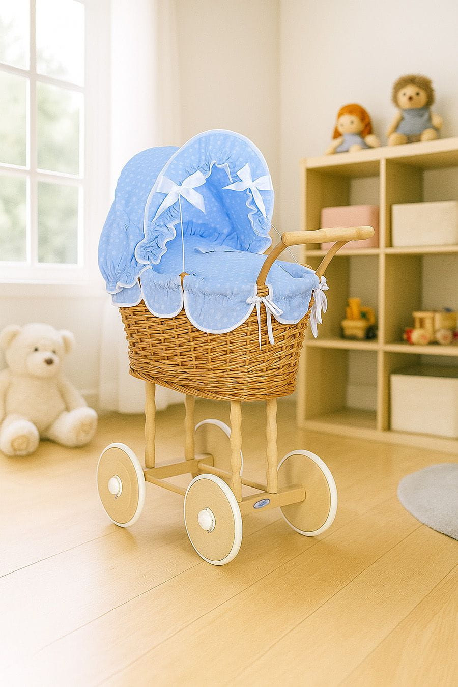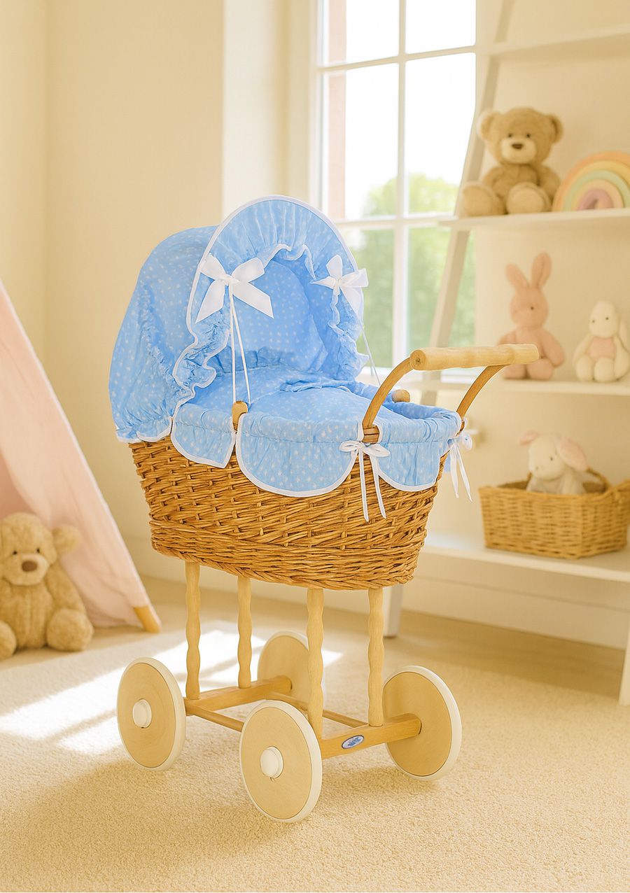 Wiklinowy wózek dla lalek wysoki z niebieską pościelką i wyściółką NATALIA naturalny
