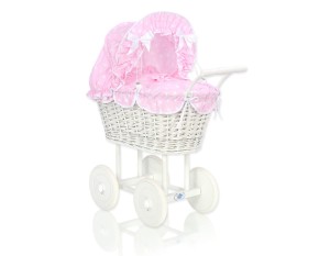 Wiklinowy wózek dla lalek wysoki z różową pościelką i wyściółką- biały