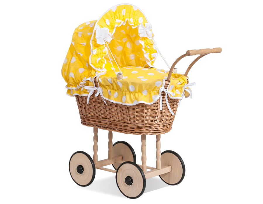 Wiklinowy wózek dla lalek wysoki z żółtą pościelką i wyściółką NATALIA naturalny