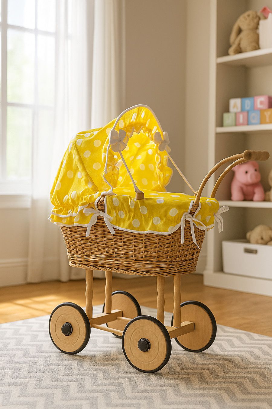 Wnętrze wózka wyłożone jest miękką, bawełnianą wyściółką i wyposażone w komplet pościeli dla lalek. Ruchoma budka z tkaniny, ozdobiona kokardkami, dodaje całości wyjątkowego uroku.