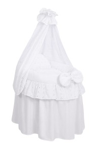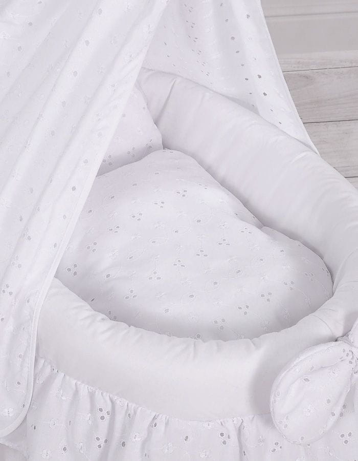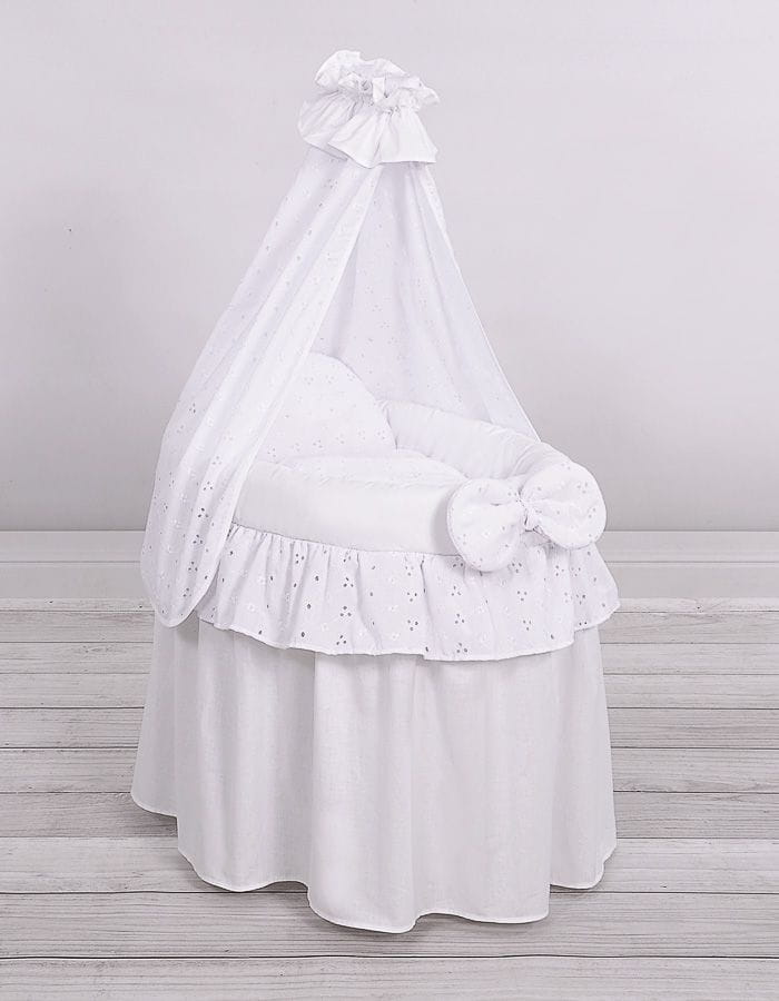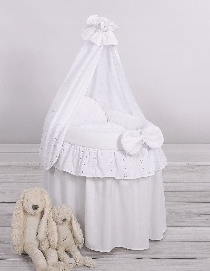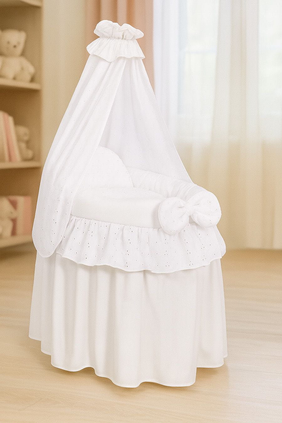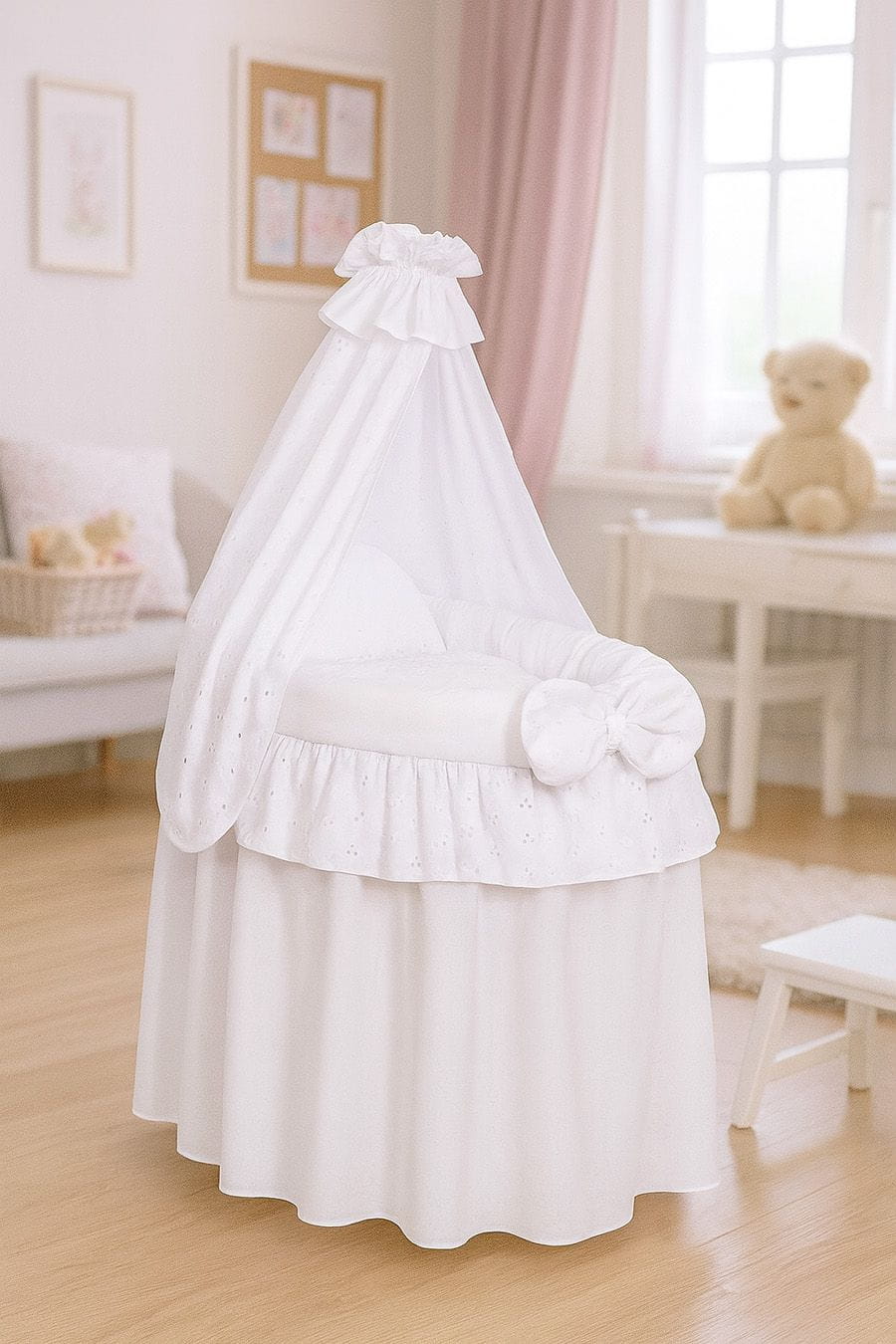 Wózek dla lalek Kosz Mojżesza dla lalek z baldachimem AURORA biały z haftowaną koronką