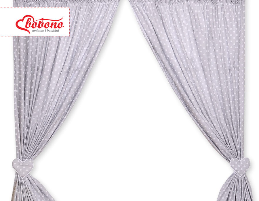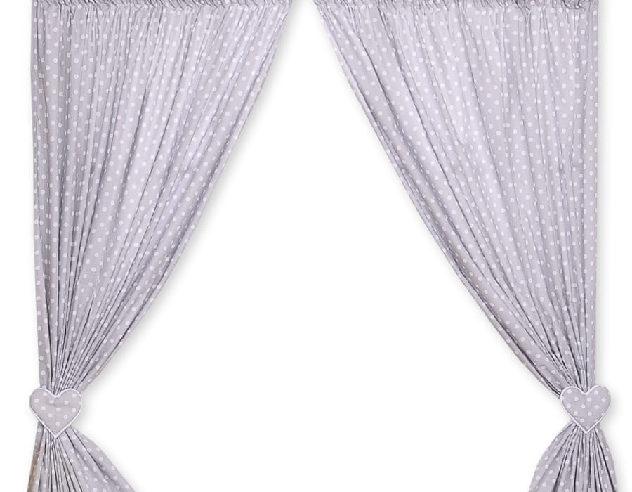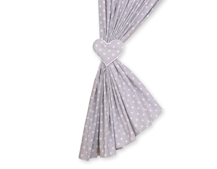 Zasłonki do pokoju dziecięcego- Wiszące serduszka białe grochy na szarym
