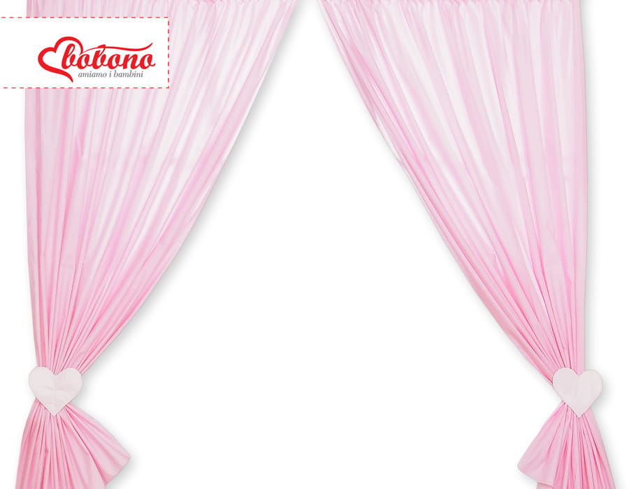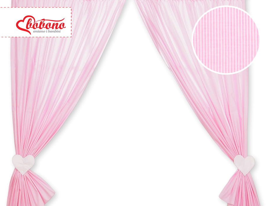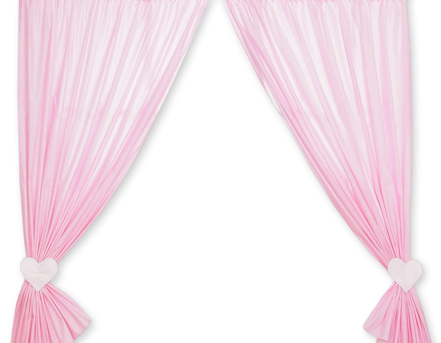 Piękny komplet zasłonek z serduszkami i szarfami do związania po bokach. Wykonane z tkaniny bawełnianej. Góra zasłonek obszyta taśmą do łatwego i równego zmarszczenia. Idealnie uzupełniają pokój dziecięcy tworząc harmonijną całość z pościelą na łóżeczku.