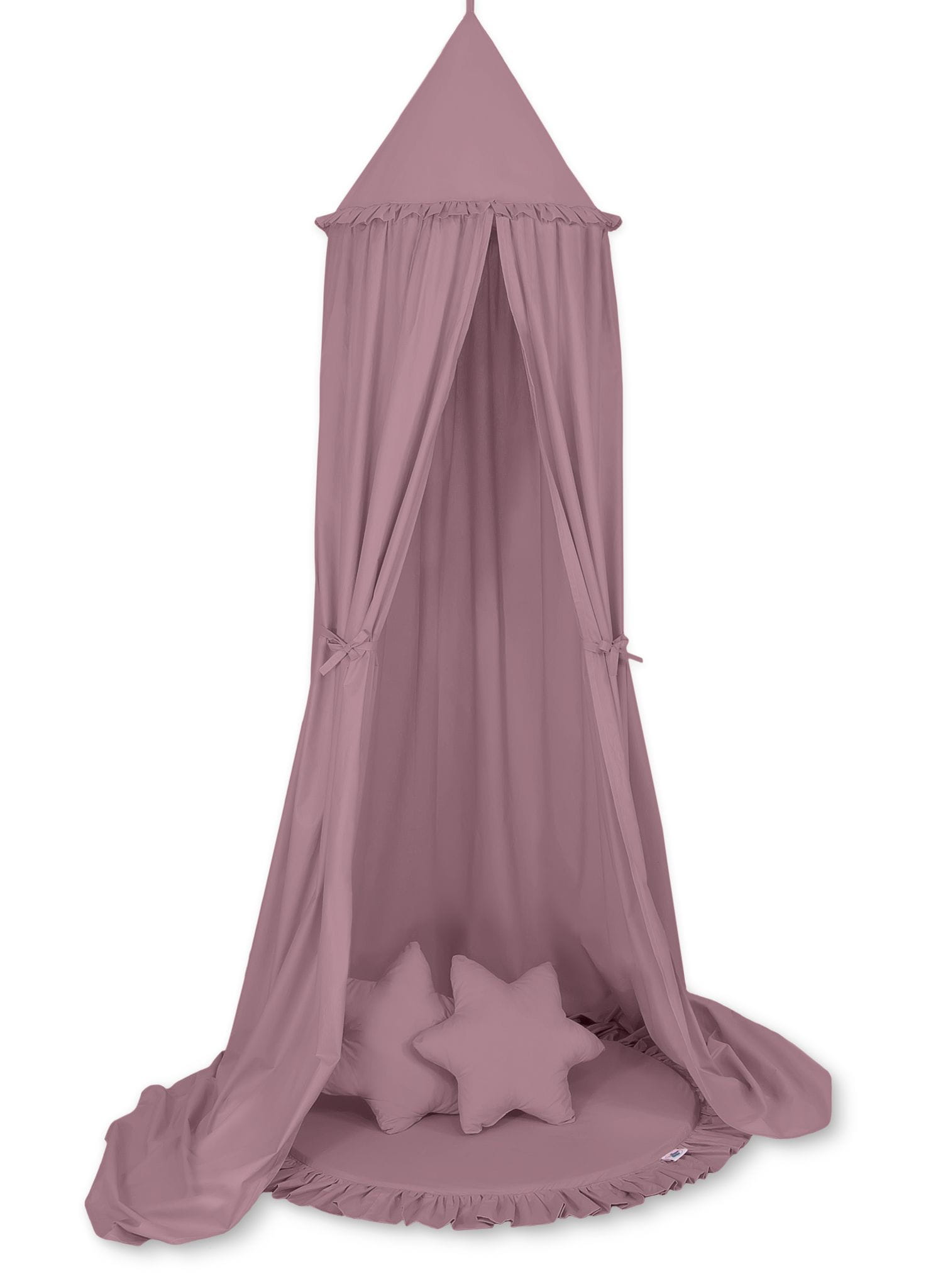 Zestaw: baldachim wiszący do pokoju dziecięcego, mata z falbanką, poduszki - róż retro