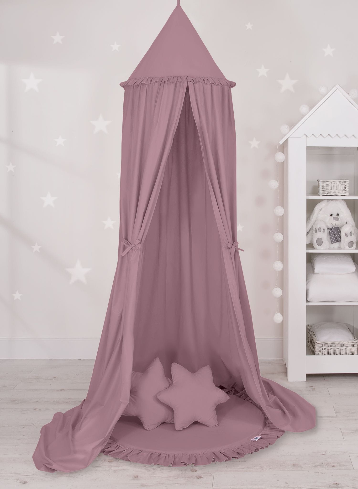 Zestaw: Piękny bawełniany duży baldachim do pokoju dziecka, miękka mata do zabawy, dwie poduszki gwiazdki.