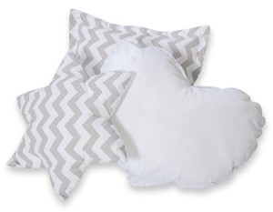 Zestaw miekkich, puszystych, poduszek, dopasowanych kolorystycznie do namiotu. Każda poduszka w innym oryginalnym, dekoracyjnym kształcie. Poduszki są dwukolorowe - każda strona z innego materiału. Doskonałe także jako kolorowa, miękka dekoracja pokoju dziecięcego.